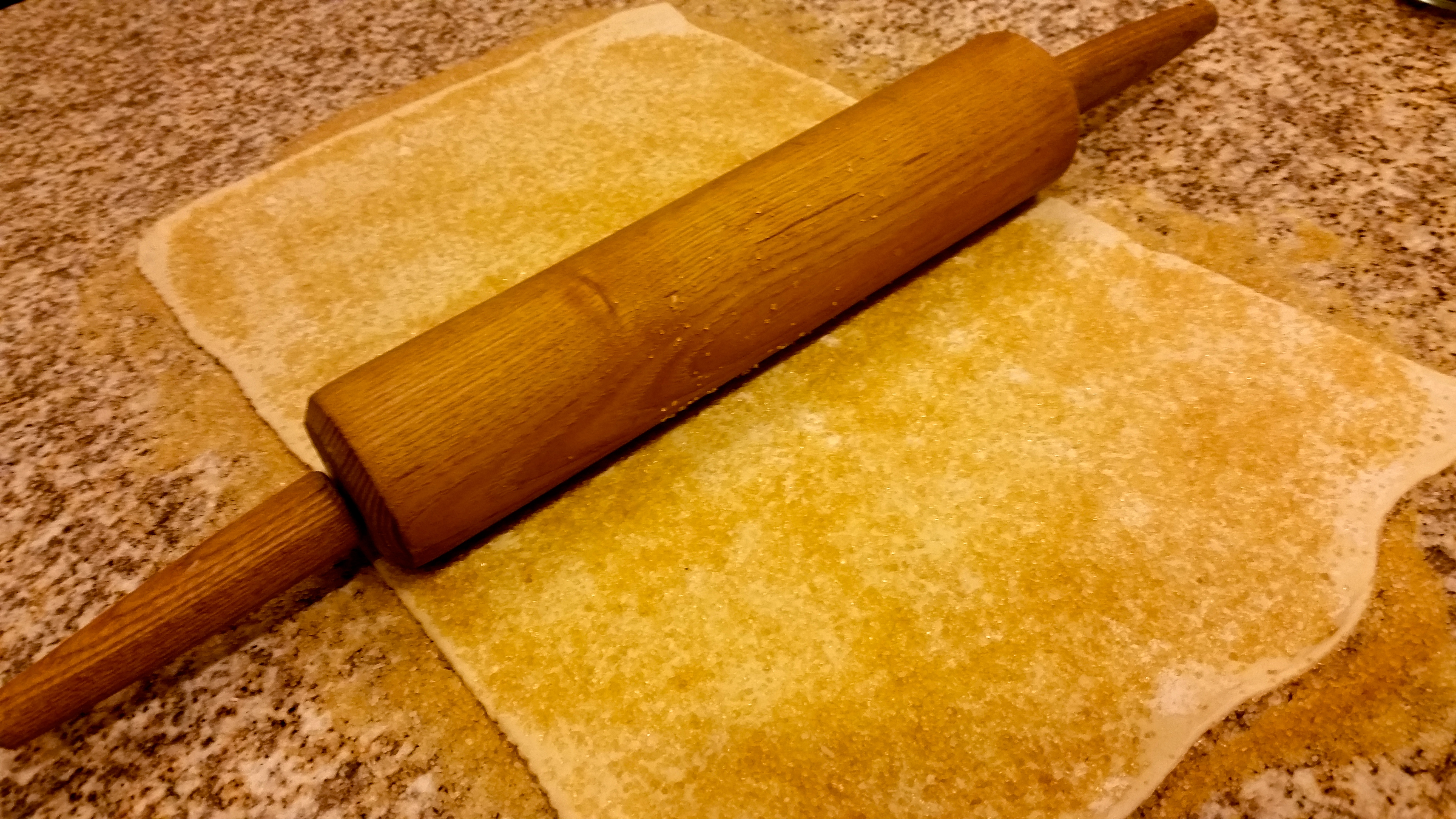 4. Using a rolling pin, roll out puff pastry until sugar is embedded into pastry.