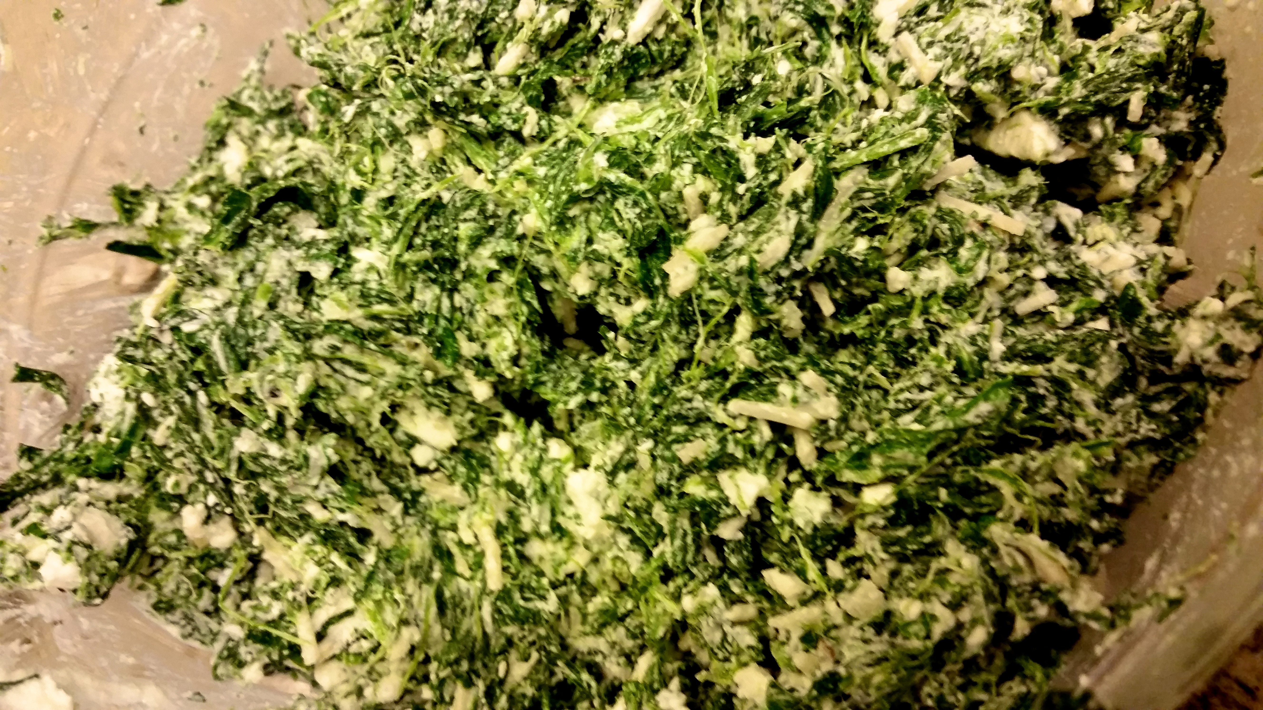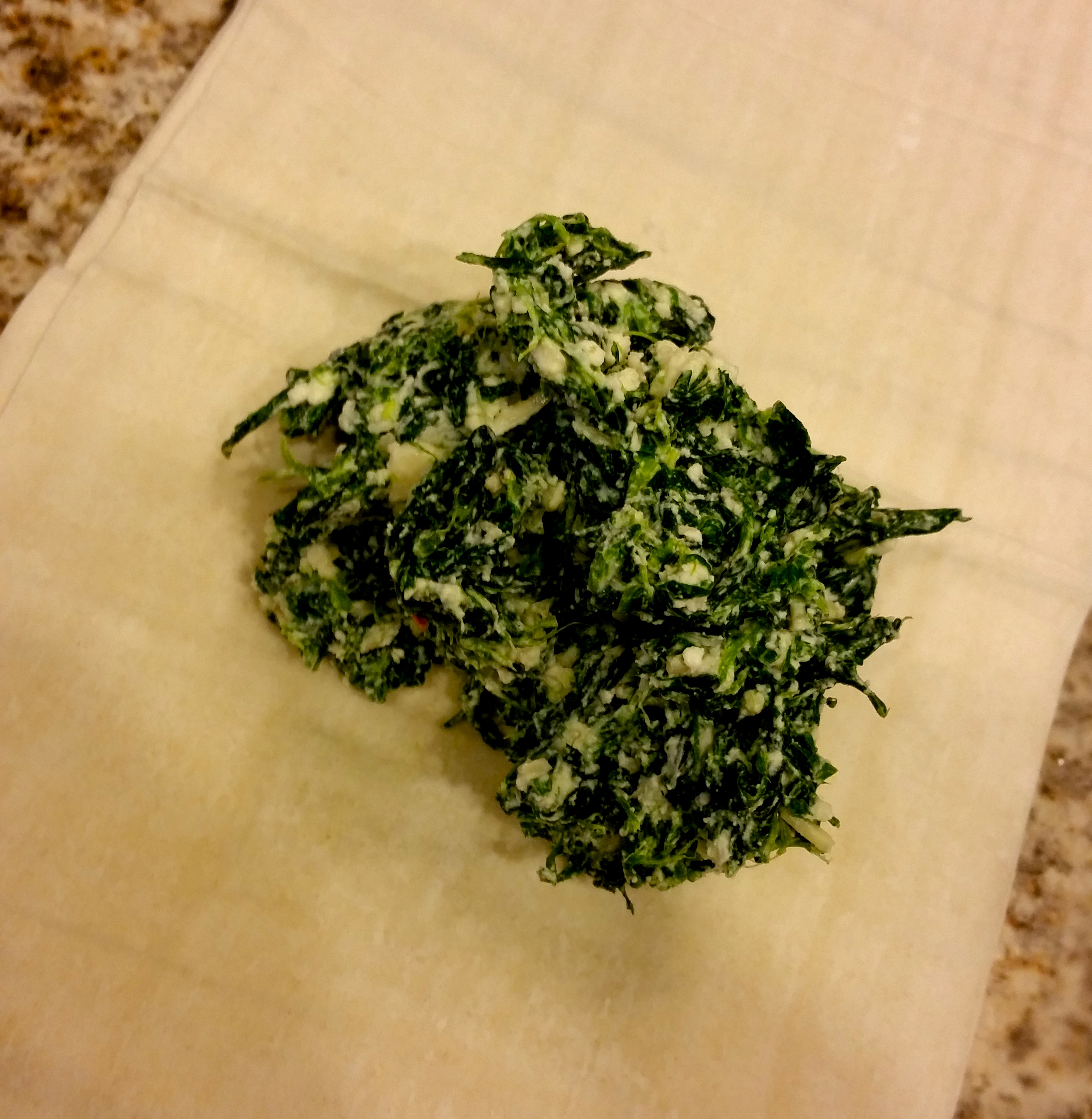 3. Unroll thawed filo dough onto clean dry surface. Cut in half lengthwise and stack into one neat pile. 4. Spoon a heaping spoonful of spinach mixture onto one end of the pile of Filo strips.