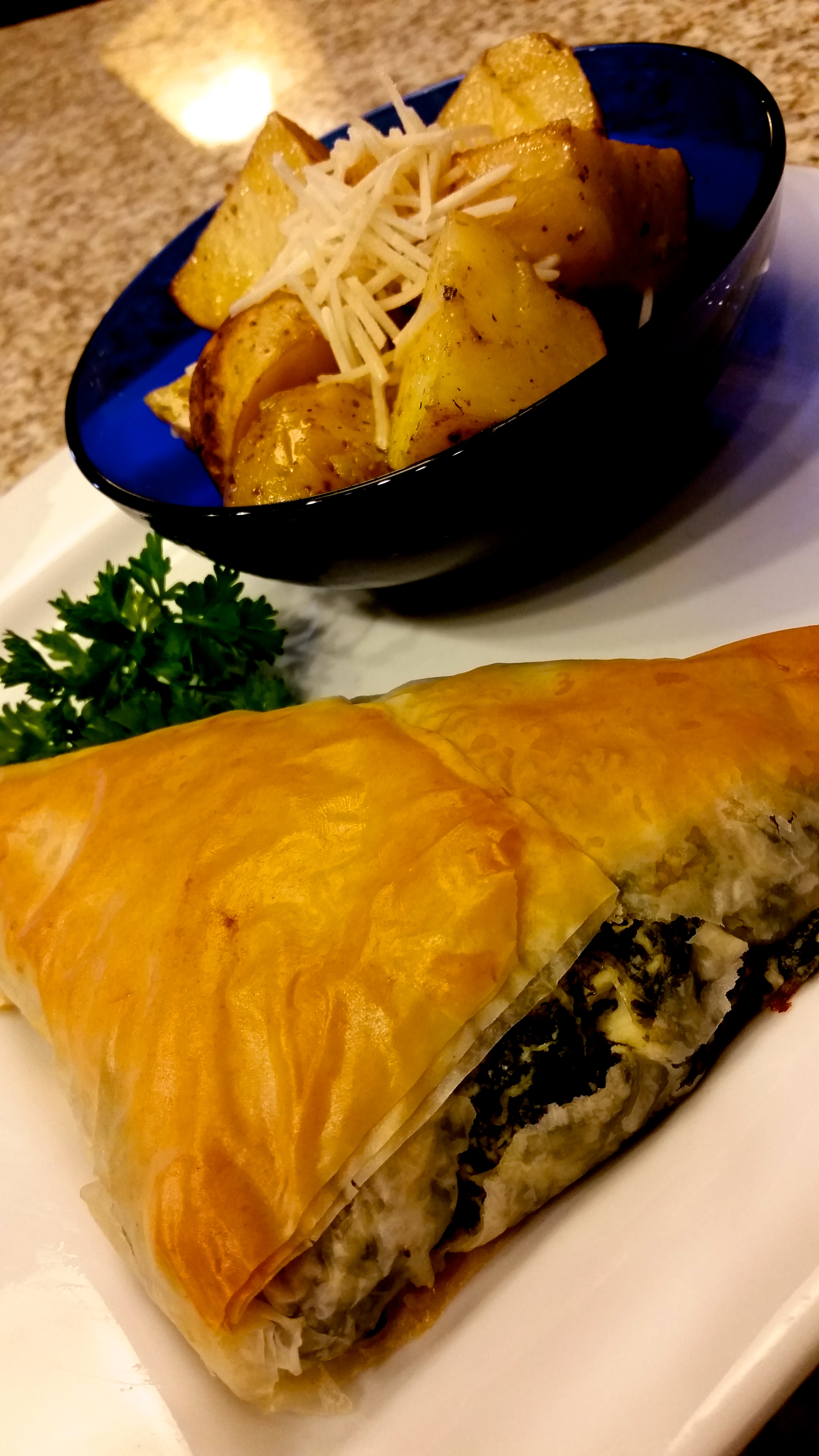 Traditional Spanakopita calls for shallots, scallions and egg. However, The Phoody took some creative liberties. In place of these ingredients, I have substituted garlic for the the piquant flavor of the shallots and scallions, making the overall result more savory. I also substituted the egg for a few different cheeses, giving it the same hold, but more flavor. I urge you to do your thing, and try your own variation to suit your unique tastes. Serve with a nice Sauvignon Blanc…or a few shots of Ouzo.