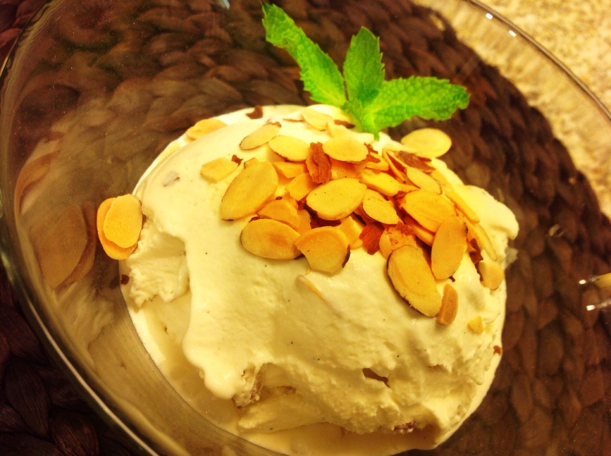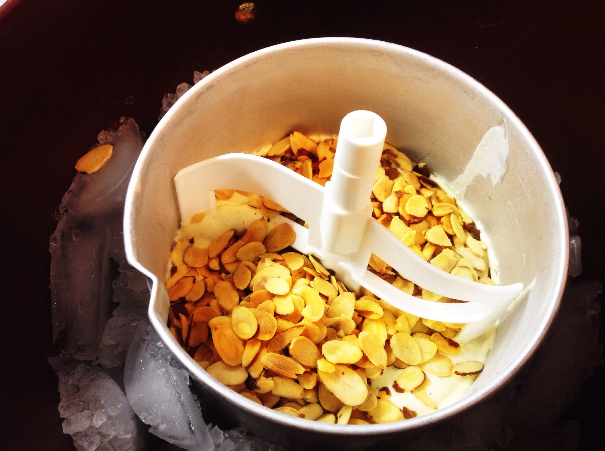 14) When ice cream starts to thicken slightly, add the chilled toasted almonds to the machine, and allow ice cream to set completely.