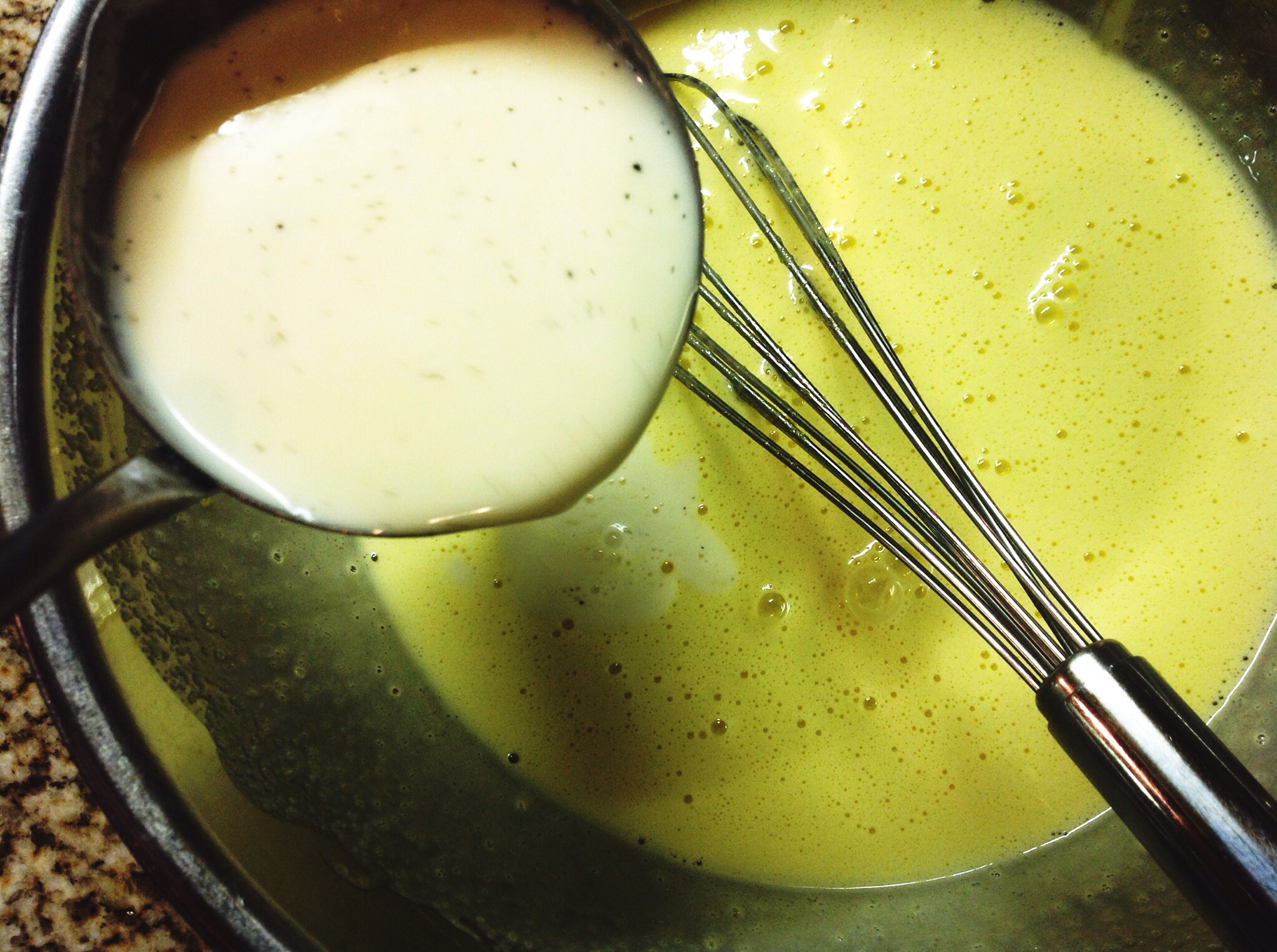 7) Using a ladle or heat proof measuring cup, ladle approximately one cup of the hot cream mixture into the egg mixture while whisking. This will temper the egg mixture and keep your ice cream from tasting like there are scrambled eggs in it. Just the thought makes me dry-heave a little.