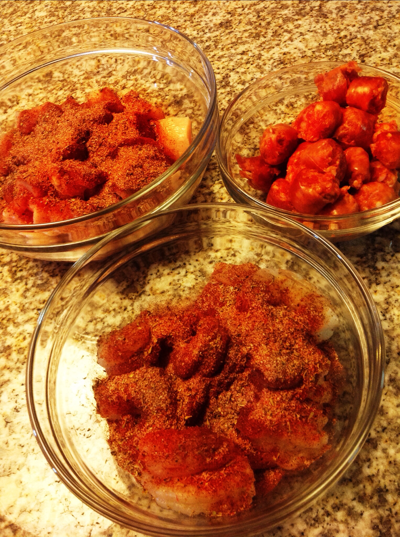 3) Add about 1 T. Creole seasoning to cubed chicken, and 1 T. to the chopped shrimp (separate bowls) and coat evenly. Let sit while you prepare the rest of the dish.