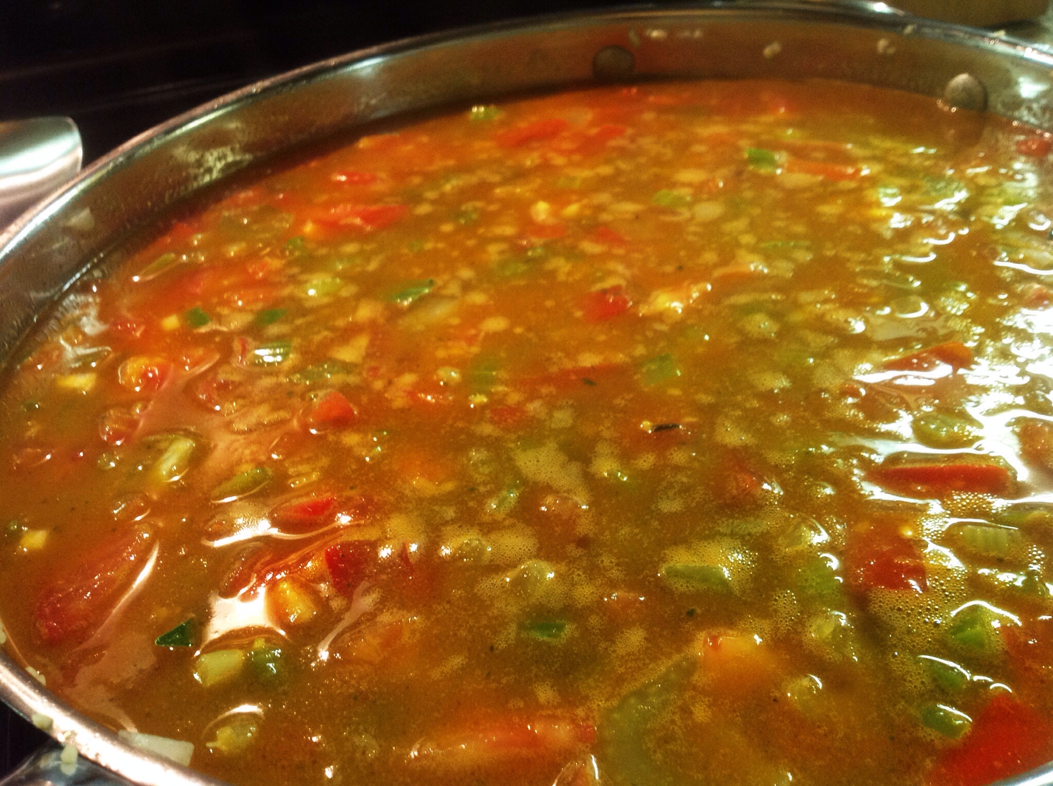 11) The final result should be moist, but not soupy. If it seems too soupy, allow it to cook a while longer without a lid until most of the liquid has been absorbed by the rice.