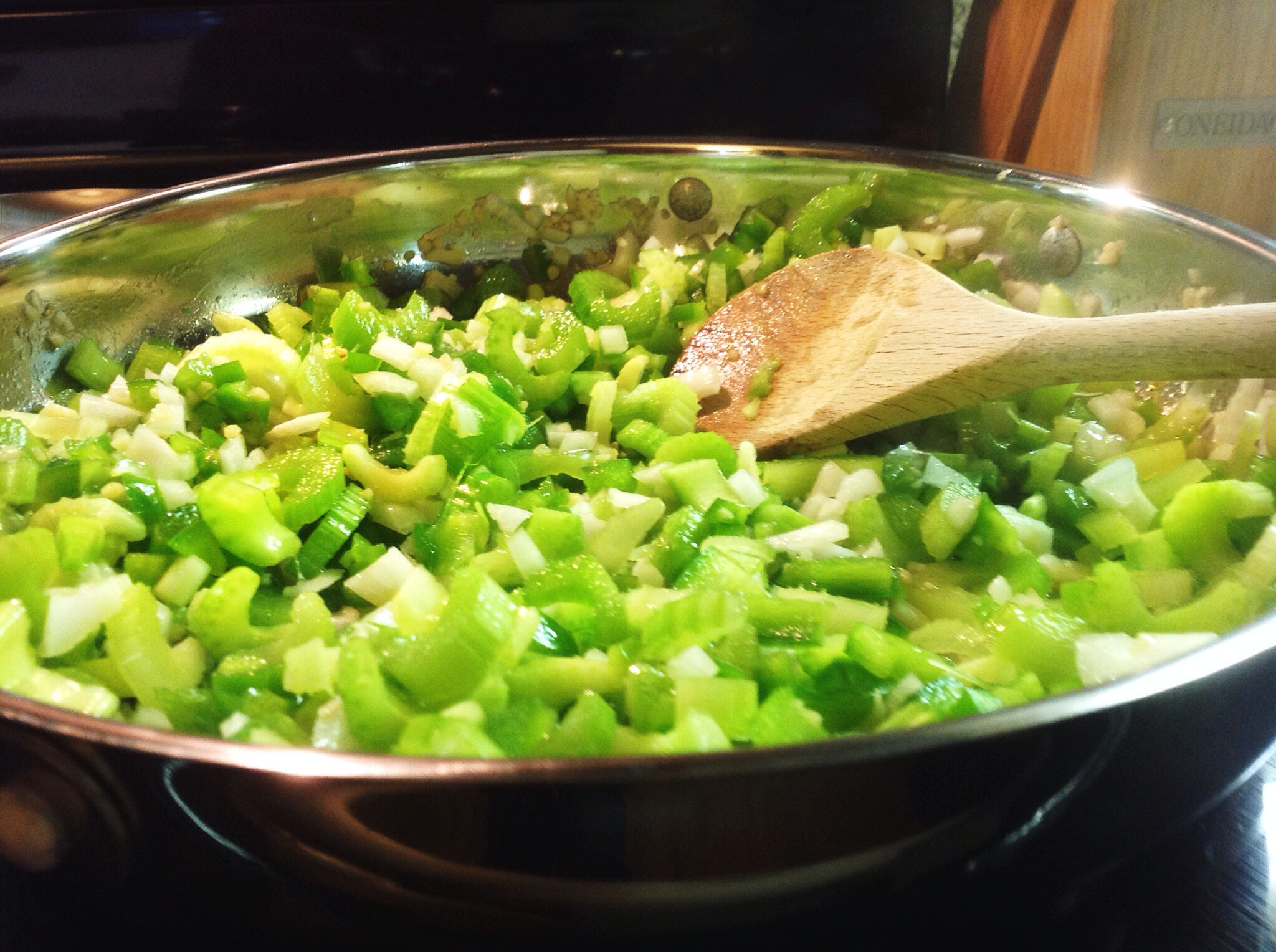 4) Simmer chopped onion, celery and green pepper in olive oil over medium high heat in a deep skillet for approximately 3 minutes. You don’t want to overcook them. Heat them through, but the real cooking will come later.
